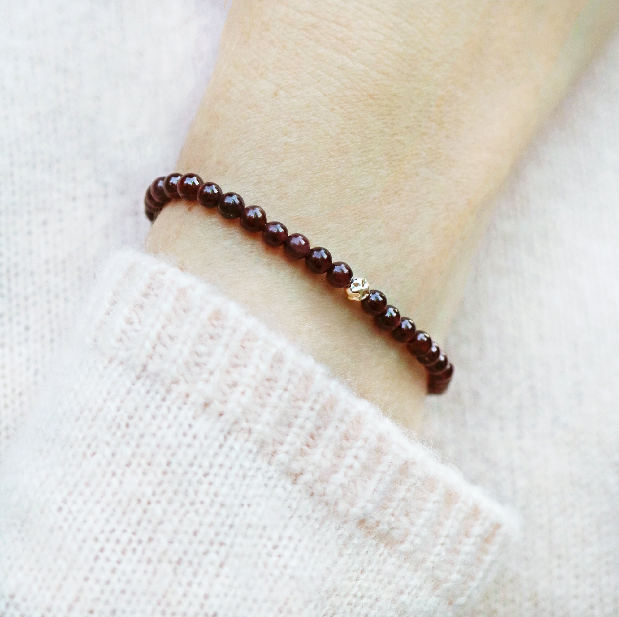 Dainty bracelet featuring mindfully hand-selected AAA grade natural round garnet gemstones accented with a precious metal hammered sphere. Strung on a durable stretch cord for ease of wear.