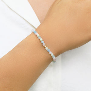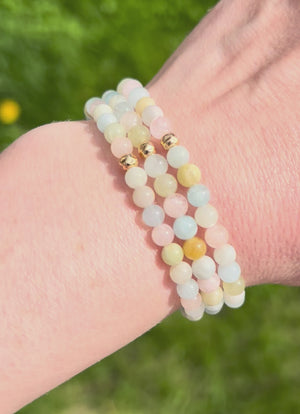 Dainty gemstone bracelet with mindfully hand-selected natural round aquamarine, morganite and heliodorgemstones accented with a precious metal textured sphere.